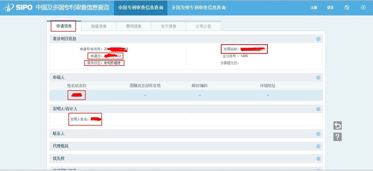 d. 在详情页,点击"申请信息",可查看专利申请日、申请人、状态等信息