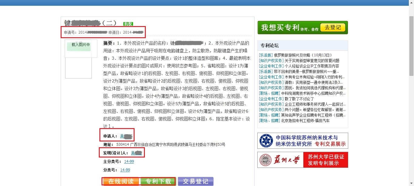 c. 跳转至搜索结果页后,可查看专利申请日、申请人、状态等信息,并可在线阅读或下载专利内容。