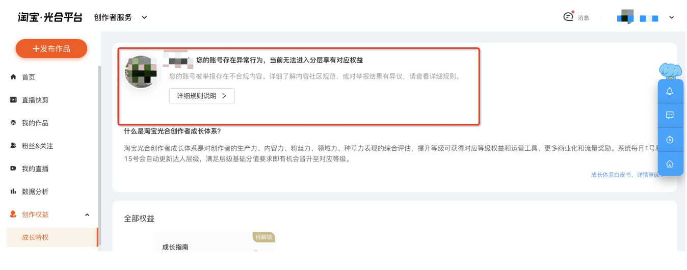 如您进入到【光合平台-创作权益-成长特权】-查询到页面提示”账户存在异常行为“,请点击详细规则说明,按语雀申诉规范指引操作即可。该申诉,一月仅支持申诉1次,提交申诉后20个工作日出结果。 申诉入口素材及申诉文件详见语雀文档:《违规与申诉》