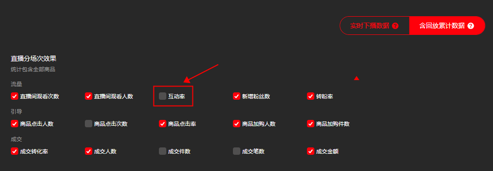 互动率是指本场直播互动用户数/直播间访问用户数,互动行为包含点赞、评论、分享、关注(含预告和回放);