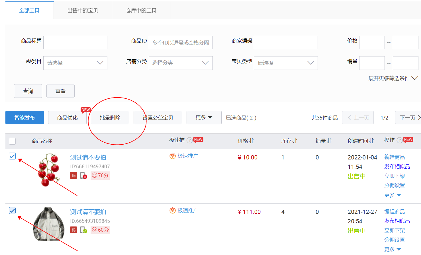 【出售中的宝贝】和【仓库中的宝贝】页面的商品都可以删除,您勾选需要删除的商品,点击“删除”即可。
