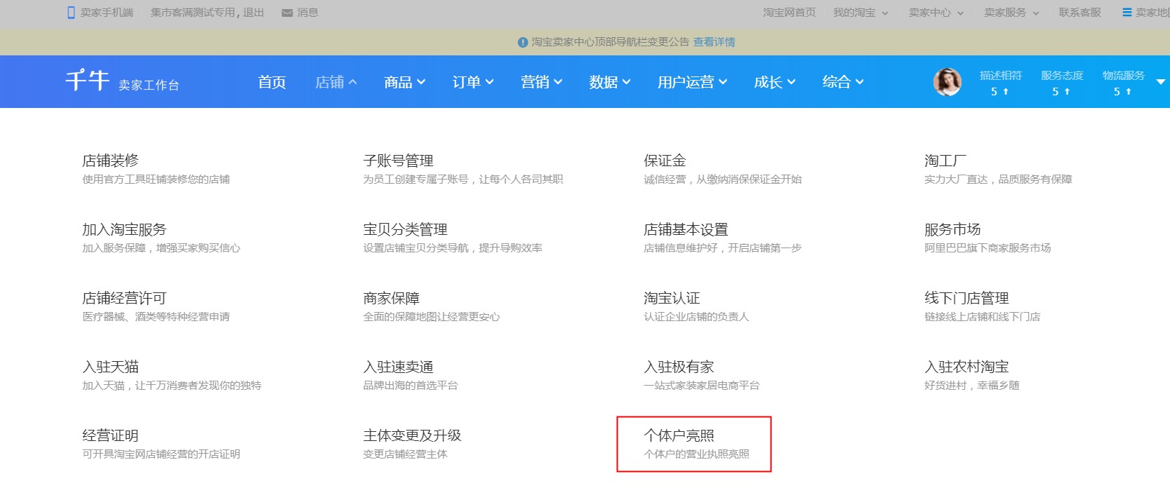 亲,若您已经办理的是个体工商户执照,但不想变更经营主体的,可以登录【卖家中心】,点击导航栏中【店铺】-【个体户亮照】,选择“个体户亮照”后根据页面提示填写相关信息并上传营业执照照片。同时要求,您的淘宝店铺认证人信息必须与营业执照上的经营者姓名保持一致。