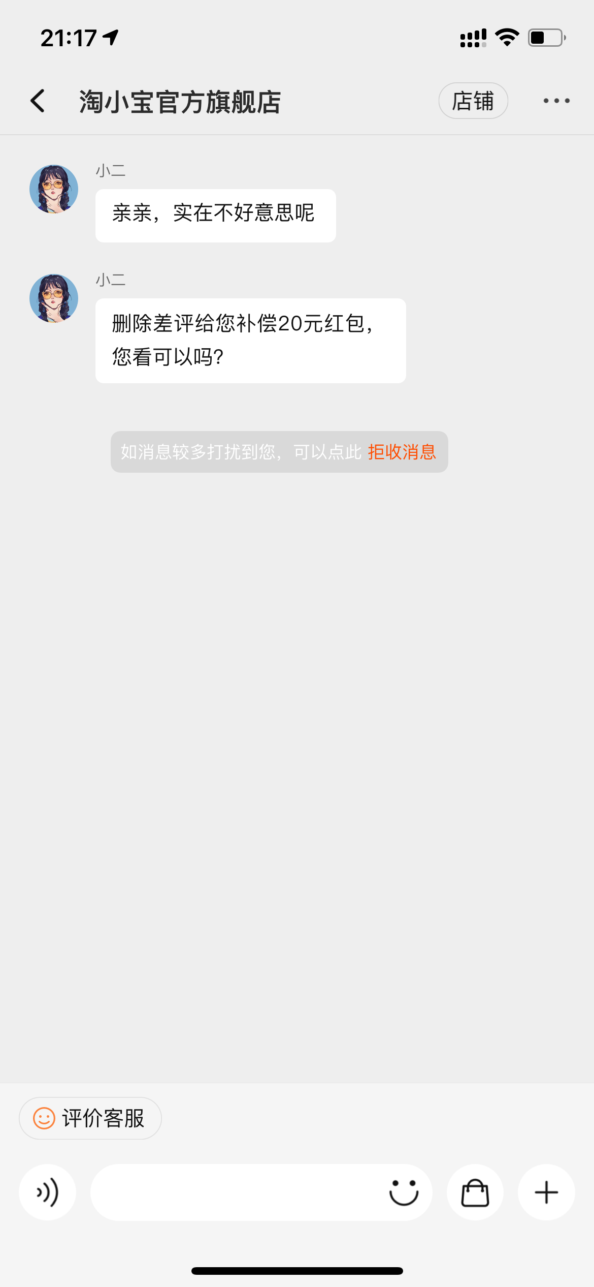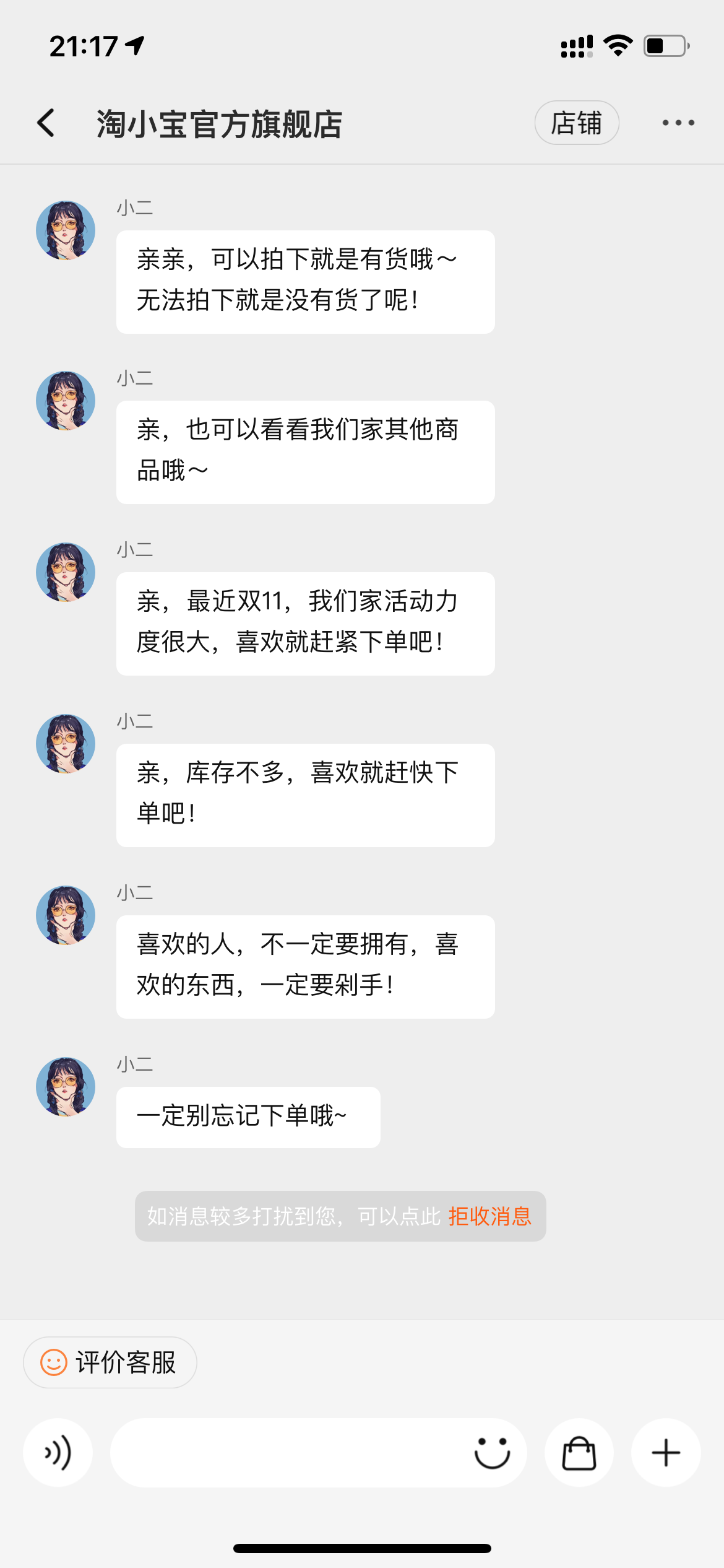 1、当客服“连续发送消息达到5条”或“发送平台不鼓励的评价消息(好评返现、诱导中差评改好评)时”,买家端提示:「如消息较多打扰到您,可以点击拒收消息」。