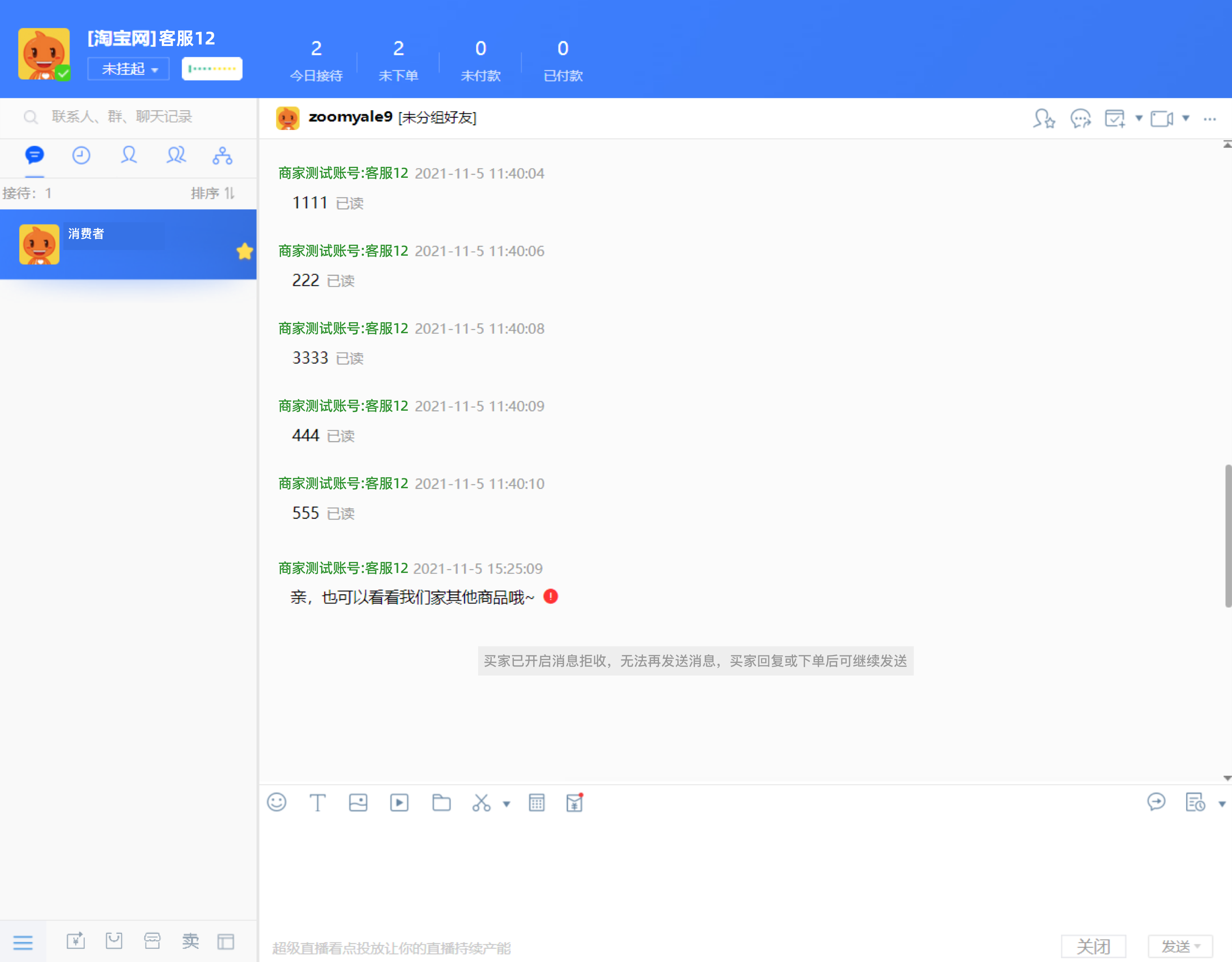 当买家拒收消息后,在买家没有发送新消息或下单之前,如果商家继续发送消息,消息将不会发送成功,并同时提示「买家已开启消息拒收,无法再发送消息,买家回复或下单后可继续发送」。