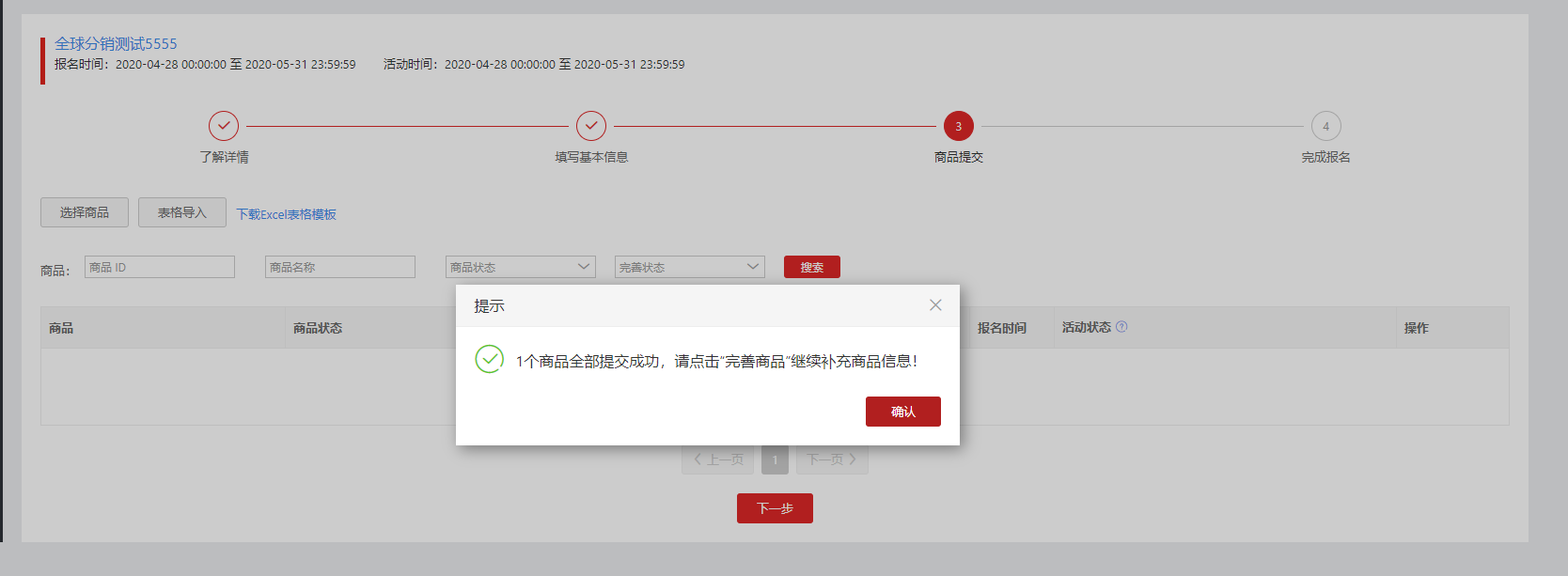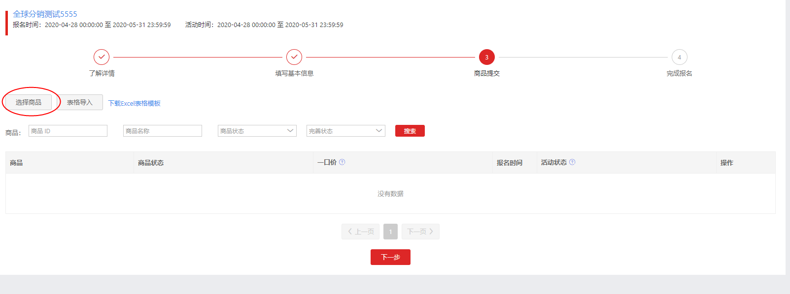下载excel表格模板,然后按照模板格式上传需要报名的商品id即可