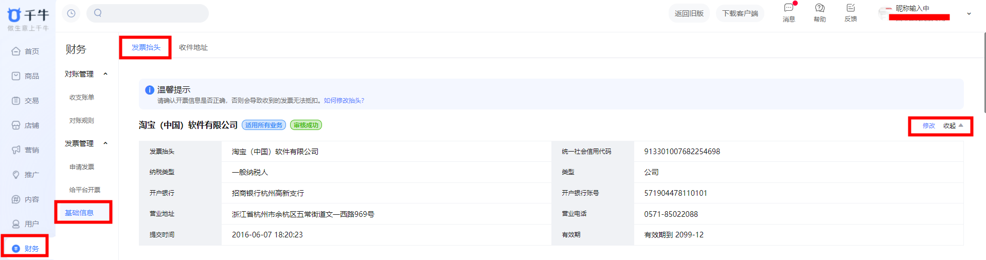 ii、完成支付宝账户的变更后,登录【千牛工作台】-【财务】-【基础信息】-【发票抬头】,点击【修改】,见下图所示: