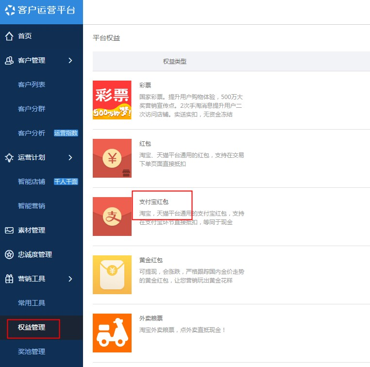 1、在【客户运营平台】-【营销工具】-【权益管理】-【支付宝红包】
