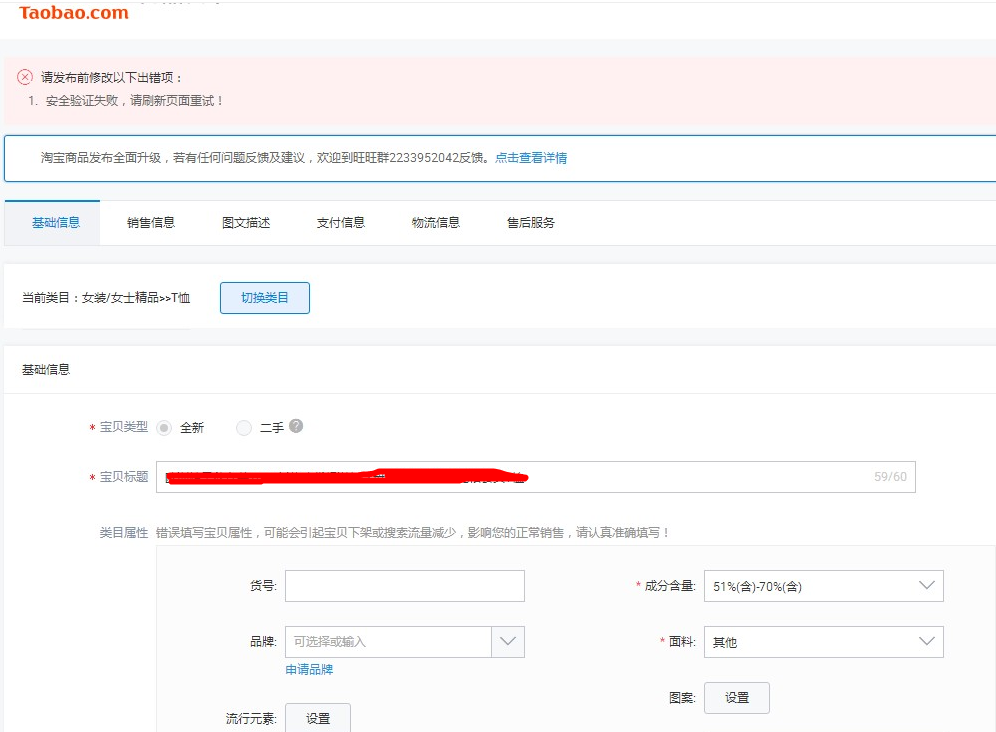 若您使用新版发布页发布商品时,报错提示“安全验证失败,请刷新页面重试!”,麻烦您刷新该页面,填写安全验证码。