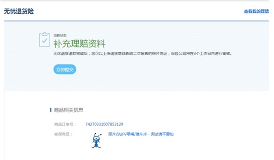 3) 若商品影响商品完好,同意退款,退款完成之后,卖家在已卖出的宝贝找到对应订单,点击保险服务,进入保单页面提交理赔申请,如下图,上传发货物流凭证、退货物流凭证、影响商品完好销售的退货商品照片、保险客服将在3个工作日内完成审核并赔付到卖家的支付宝账户。理赔金额为退款成功金额。