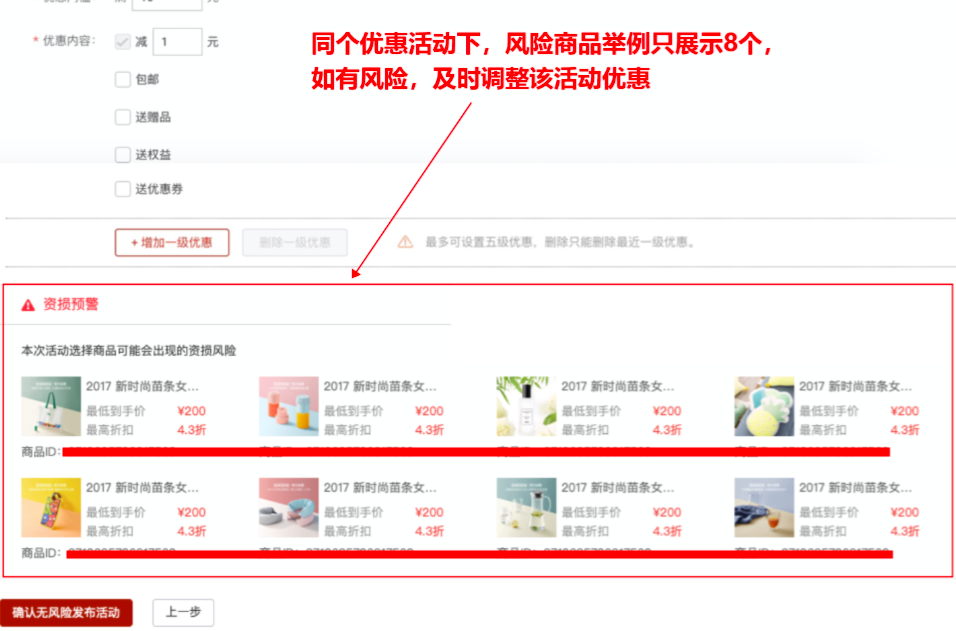 亲,设置的优惠券活动类型是“全店参与” ,系统会在设置页面底部展示资损预警列表,列举8个高资损风险商品(会展示商品对应的最低到手价和最高折扣信息)供参考。如有风险,请及时调整当下设置的优惠门槛及内容。如无风险,点击“确认无风险发布活动”即可。另外,也可到营销健康中心去整改这些高风险商品,具体教程请点此查看;