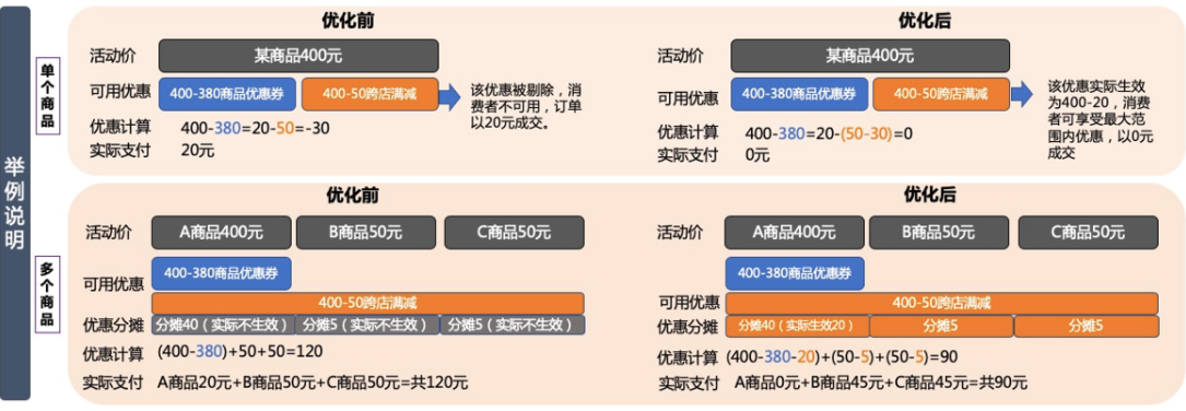 某商品活动价为400元,有一张400-380的商品优惠券,且同时支持400-50的跨店满减。商品先使用优惠券抵扣后,剩余20元;再继续使用跨店满减,则会出现订单实付金额为负数(20-50=-30)的情况。这种情形下跨店满减将依然可使用,会按订单剩余实付金额作为优惠最大可用金额进行抵扣,故此订单优惠后价格为0元。(若有跨店凑单的商品,其余订单的优惠仍按比例分摊生效)