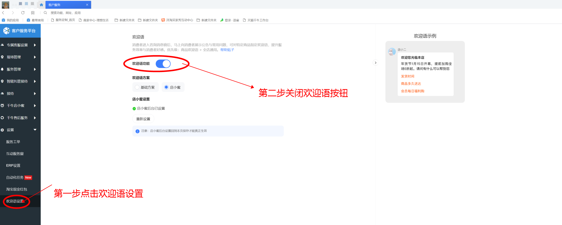 请您在千牛工作台搜索【客户服务】,进入客户服务平台,点击设置-欢迎语设置,点击关闭欢迎语功能即可。