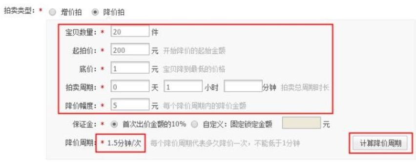 ① 降价周期:每个降价周期代表多久降一次,不能低于1分钟;填好宝贝数量、起拍价、底价、拍卖周期、降价幅度这几个数据后,点击“计算降价周期”按钮,系统即会帮你算出降价周期;