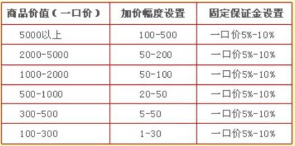 ③保证金:当买家竞拍时需要锁定保证金作为竞拍不买的违约金;默认按首次出价10%收取;若使用“自定义保证金”,则保证金为固定金额,建议按如下标准设置: