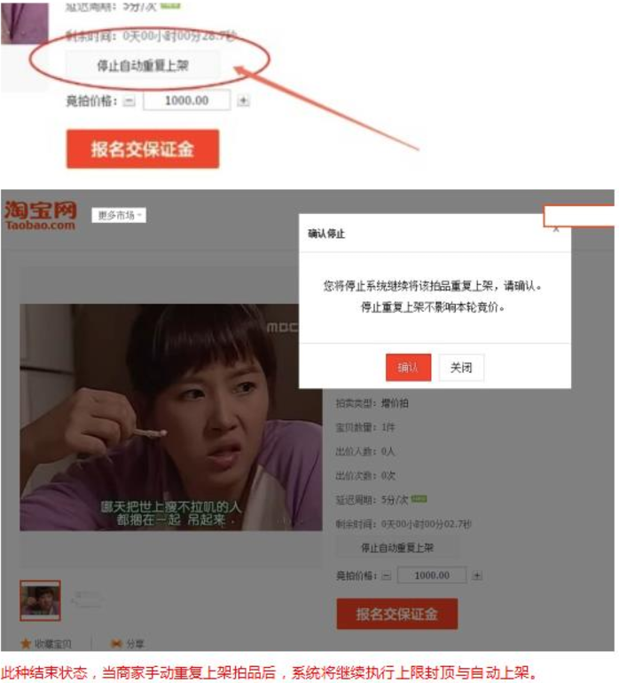 【停止重复上架】如果设置了重复上架次数或者封顶价,在开拍后,拍品将不能进行任何编辑;如果要修改,用主账号登陆前台拍品详情页,点击前台拍品详情页的 “停止自动重复上架”,则在当前拍卖结束后,系统将不会自动上架拍品,整个拍卖结束时,可对拍品进行修改。