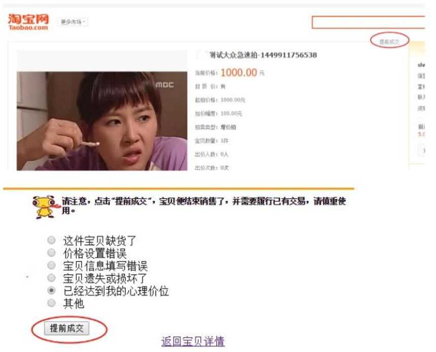 【提前成交】:拍卖时间没有结束,商品也未到达封顶价时,商家可以通过主账号登陆前台拍品详情页,点击前台拍品详情页的“提前成交“(天猫页面在商品主题右下方,淘宝页面在详情页右上角)手动结束当前拍卖,系统则重新上架,开始新一轮拍卖。