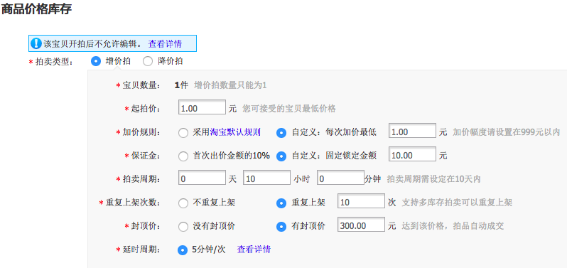 注意:降价拍一旦开拍,就不能对拍品进行任何的编辑操作,直到整个拍卖过程结束,所以设置宝贝数量和底价一定要慎重;卖家信用等级在2颗心以下的,不能发布多库存降价拍的拍品。