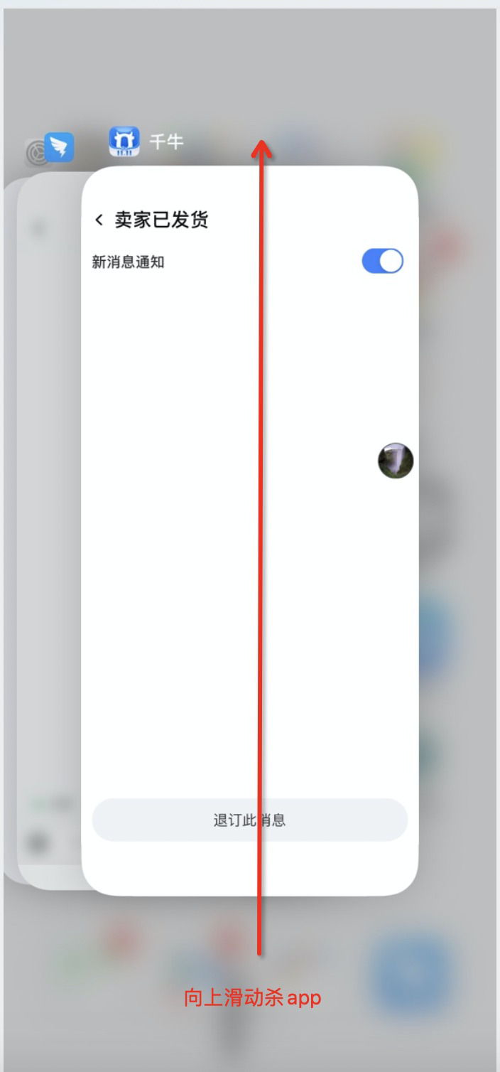 请您从屏幕下方往上滑,进入多任务界面后,在千牛的窗口中再次往上滑(如下图所示),把千牛进程关闭后,重新打开千牛,即可生效。