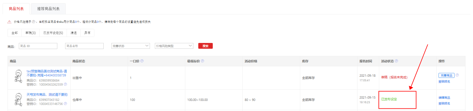 2、商品报名状态为【已发布设定】则表示报名成功,关注活动正式开始即可。如下图所示: