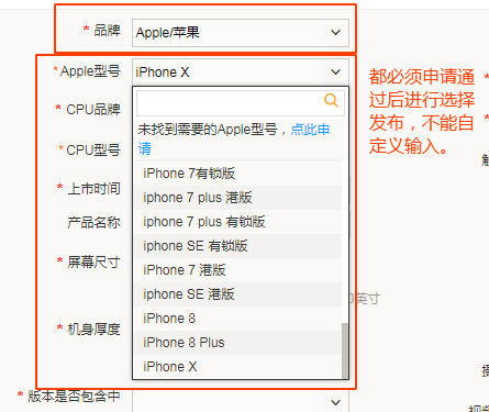 2、选择好品牌,弹出的 型号/单品/系列等子属性项下,有“点此申请”,进入申请即可