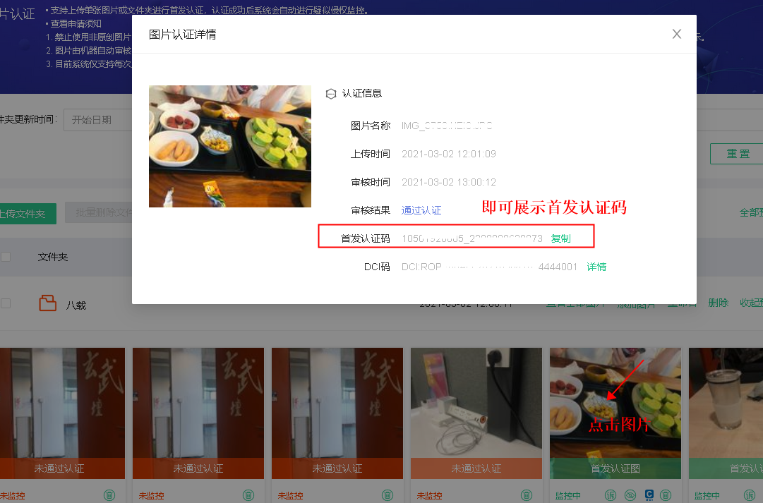第三步:输入原创资质,原创资质获取路径:原创保护-图片认证-图片管理-找到对应图片,点击图片,即可展示首发认证码。