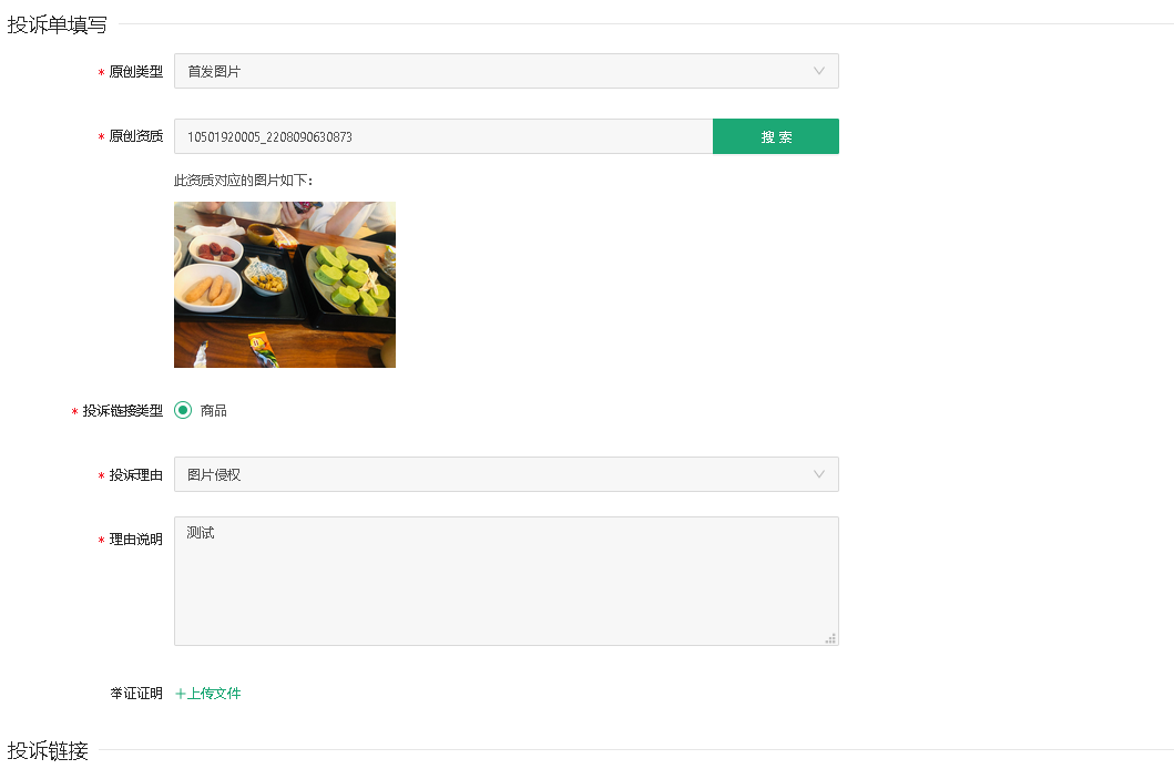 第四步:选择投诉链接类型:商品,投诉理由:图片侵权,输入理由说明,