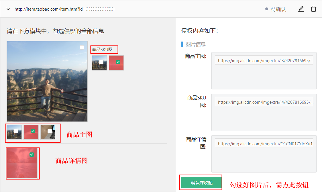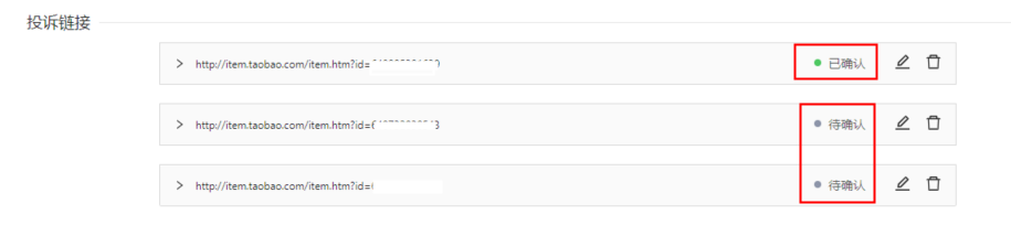 若同时投诉多个商品,需要每个链接都勾选侵权信息后,点击确认并收起,填写成功显示:已确认。