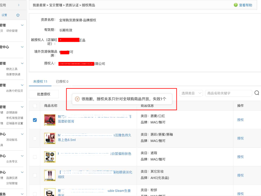 亲,全球购货源保障授权,新发布的商品需等待24小时以后才可进行授权,同时商品需有全球购商品标。不满足以上条件,会出现该报错信息。 点击展开全文 转载请注明出处安可林文章网 » 全球购货源保障授权提示授权关系只针对全球购商品开放