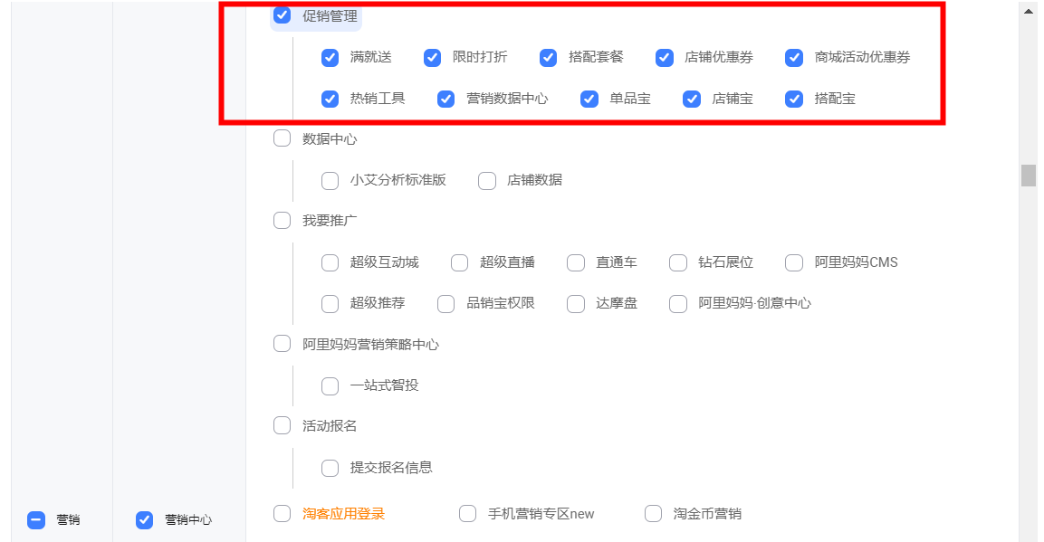 新后台授权的操作步骤:请主账号进入【卖家中心】-【子账号管理】-找到对应的子账号,点击“编辑修改权限”,在功能权限搜索并勾选“营销中心”-“促销管理”下需要使用的营销工具权限点后点击保存