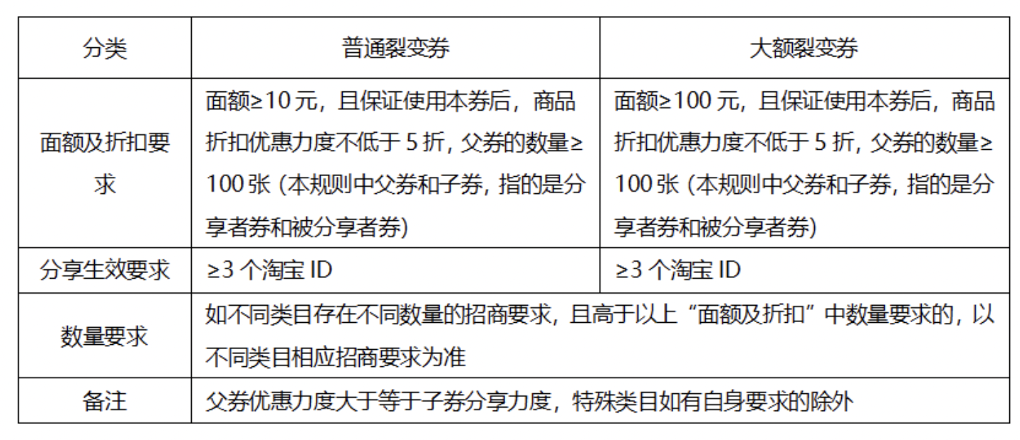 本次活动中,店铺裂变券分为“大额裂变券”和“普通裂变券”两类,具体以实际展示位置为准,招商要求如下: