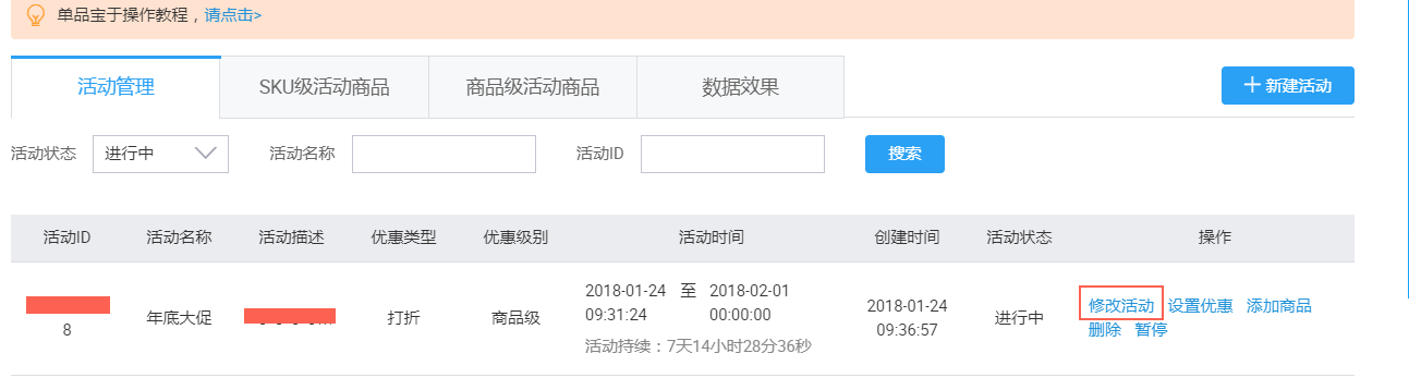 您可以进入【卖家中心】-【营销中心】-【店铺营销工具】-【优惠促销】-【单品宝】-【活动管理】页面,选择活动状态下拉列表,找到对应活动操作修改哦