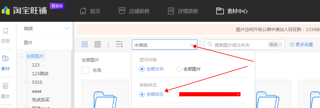 1.图片审核状态是否审核已通过,若未审核通过则不展示图片。请进入【卖家中心】-【图片空间】,鼠标线选择一级分类“全部图片”,再通过功能条筛选查看是否通过审核