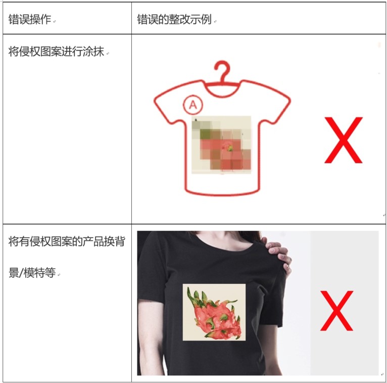 举例:权利人美术作品图案为“火龙果图案”:,小王未经授权,在宝贝主图、sku图、详情图处等多处展示该侵权图案商品,因而被投诉美术作品侵权。收到投诉通知后,小王需自检自查该宝贝,将主图、sku图、详情图处所有带有侵权图案的信息,全部进行移除。