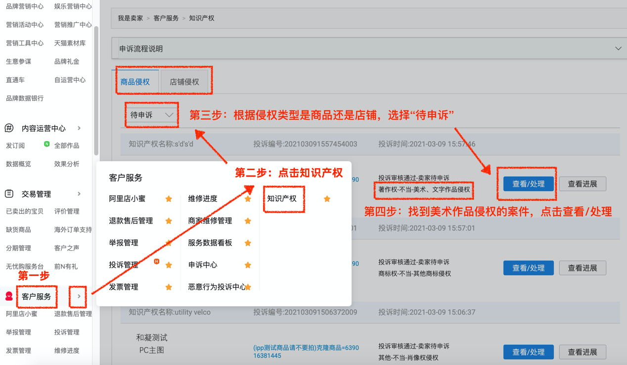 亲,若您收到“非权利人商品,但卖家在商品或描述中使用了权利人美术、文字作品内容”的通知,您可在登陆网页版【千牛卖家中心-客户服务-知识产权】,或通过 卖家中心-体检中心-找到对应违规编号-【申诉】,在商品侵权/店铺侵权处,找到“待申诉”的案件,进行查看处理。