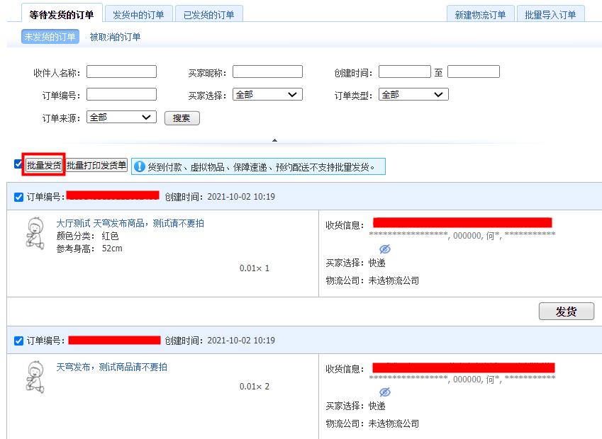 】页面,勾选需要批量发货的订单,再点击“批量发货” 按钮即可,如图: