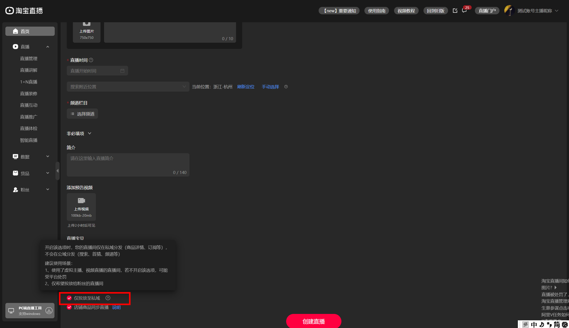 亲,未采买商业流量的虚拟主播不具有互动等能力平台会判定为录播,每次在中控台创建直播页面时,都要商家在非必填项下拉中主动勾选“仅投放至私域”,否则正常公域直播仍会被处罚哦~