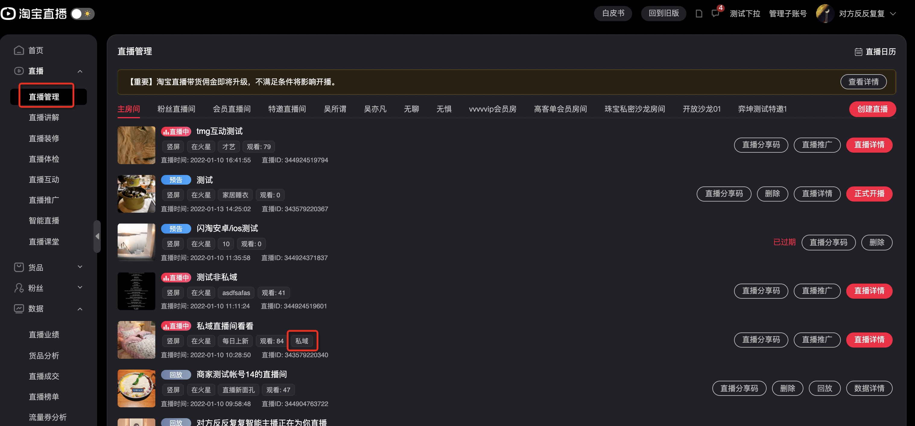 主播可自行在新版中控台-直播管理-直播列表中查询是否勾选私域直播,若勾选了私域直播会有显示哦~(预告、回放、直播中均可查看到)