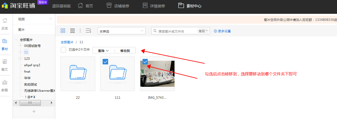 亲,图片空间的图文移动到其他文件夹的方式如下:进入【卖家中心】-【图片空间】找到要转移的图片或文件夹,勾选后在功能区选择“转移到”选择到要转移的文件夹下即可 点击展开全文 转载请注明出处安可林文章网 » 图片空间图片如何移动到其他文件夹?