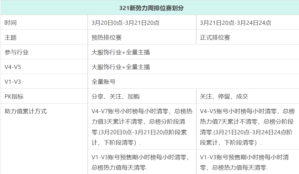 【赛道查询】赛道查询时间:3月12日;赛道查询方法请点击【时间节奏】2022年321新势力周排位赛共分为2个阶段:321预热预热排位赛>321正式排位赛【排位赛资源奖励】每条赛道小时榜TOP10且设置红包雨将会在321直播会场版头个性化透出(透出时间段:每日10点-18点)【321排位赛赛道划分规则】1、主播层级为V1-V3(筛选账号层级时间截止到2022年3月20日)赛道划分如下:赛道划分规则:主播等级对应配置名称+直播间近30天占比60%主营商品一级类目的名称2、主播层级为V4-V7(筛选层级以时间截止为2022年3月11日最新层级为准)赛道划分详情请点击帖子第三部分 点击展开全文 转载请注明出处安可林文章网 » 淘宝直播321新势力周排位赛玩法