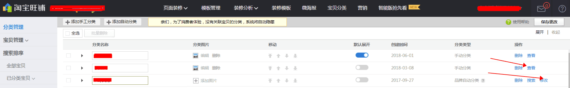【旧版分类】若需要创建/修改/删除分类,请通过点击“设置分类”进行设置;如需要设置分类上下移动和封面图,请点击“装修页面”。(建议使用低版本谷歌或UC浏览器)