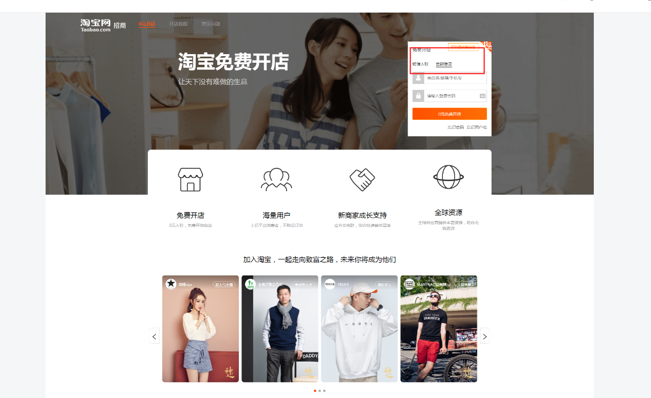 选择个人开店,通过账号密码登陆或者通过市手机短信验证码登陆(注意:若没有淘宝账号,手机验证码登陆之后会自动生成淘宝账号)