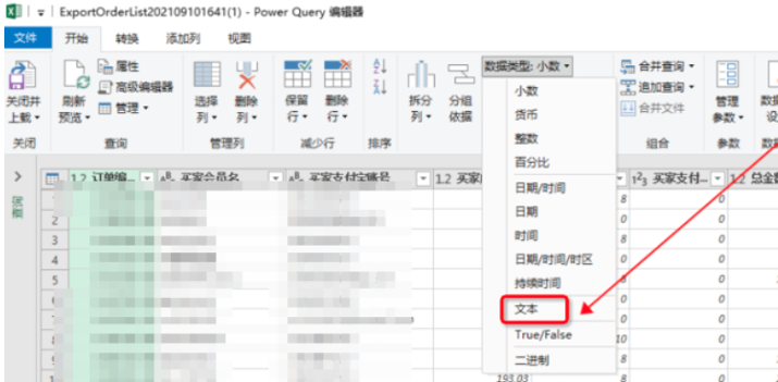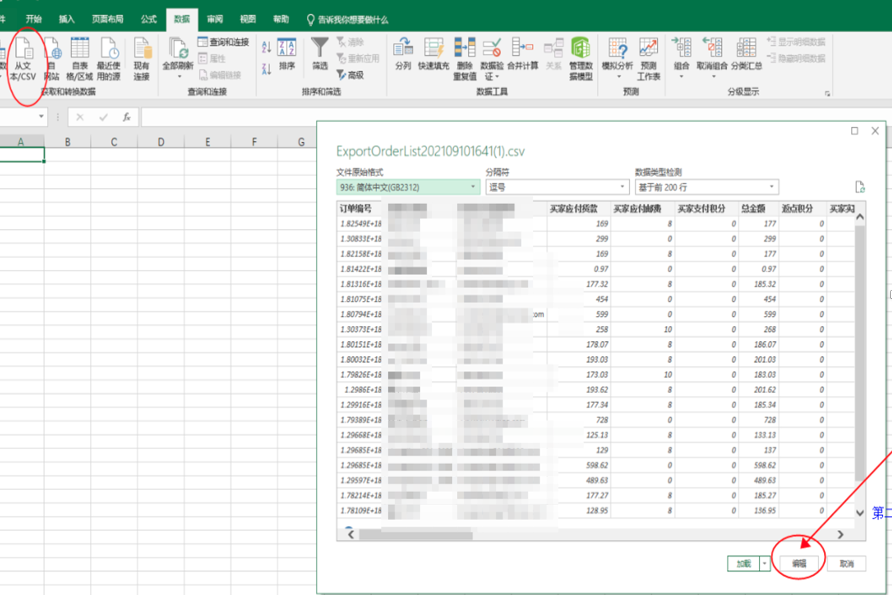 3)新建空白EXCEL表格-点击【数据】-【从文本/CSV】-导入之前下载的账单原始文件,点击:编辑,选中表格“订单编号”列,点击:数据类型,选择:文本,即可正常显示订单号。