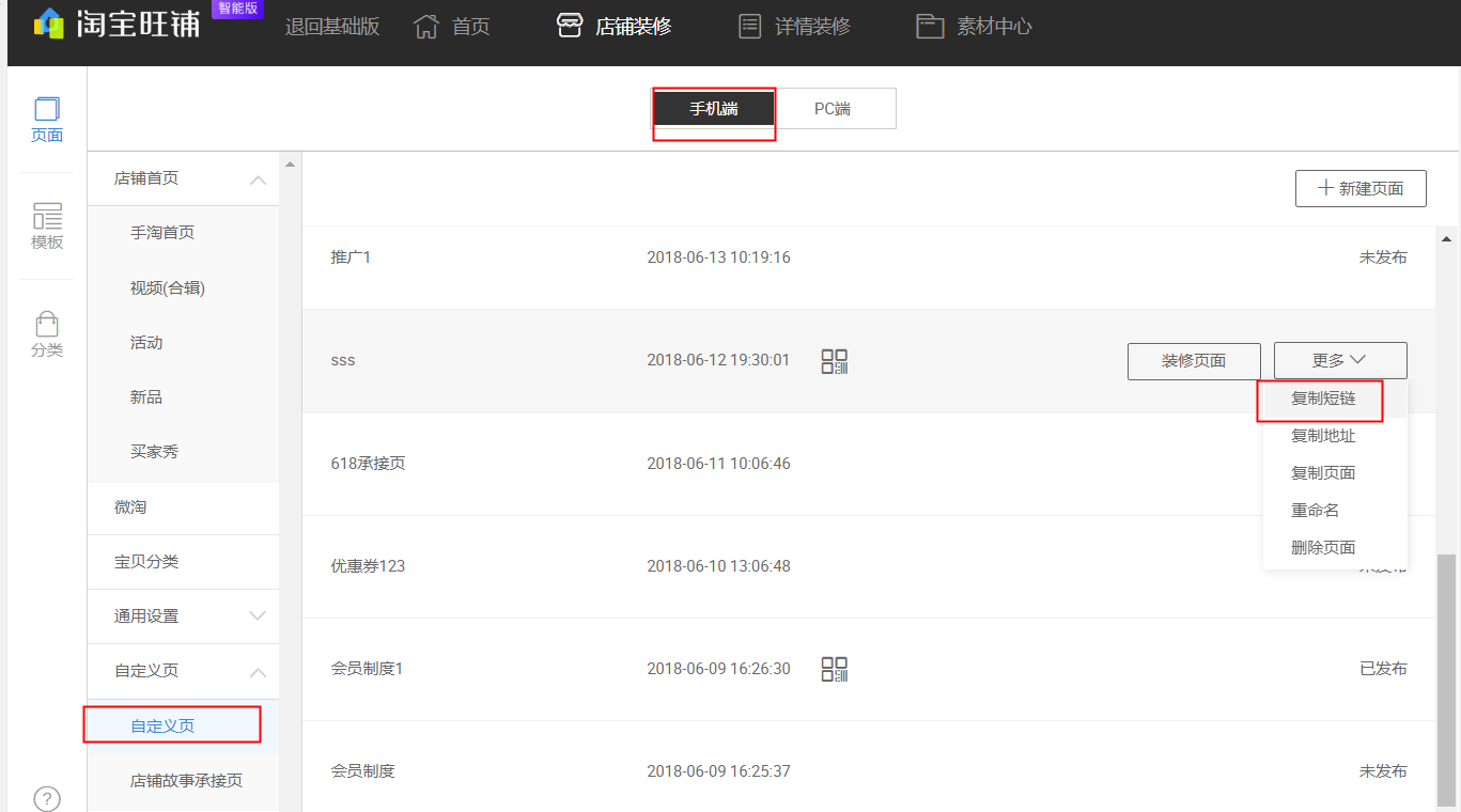 请进入【卖家中心】-【店铺装修】-【手机端】-【自定义页】找到要获取链接的自定义页,点右侧“更多”-‘复制短链’;