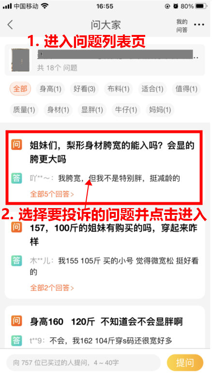 第一步:进入问题列表页,并选择您要投诉的问题,点击进入问题详情页