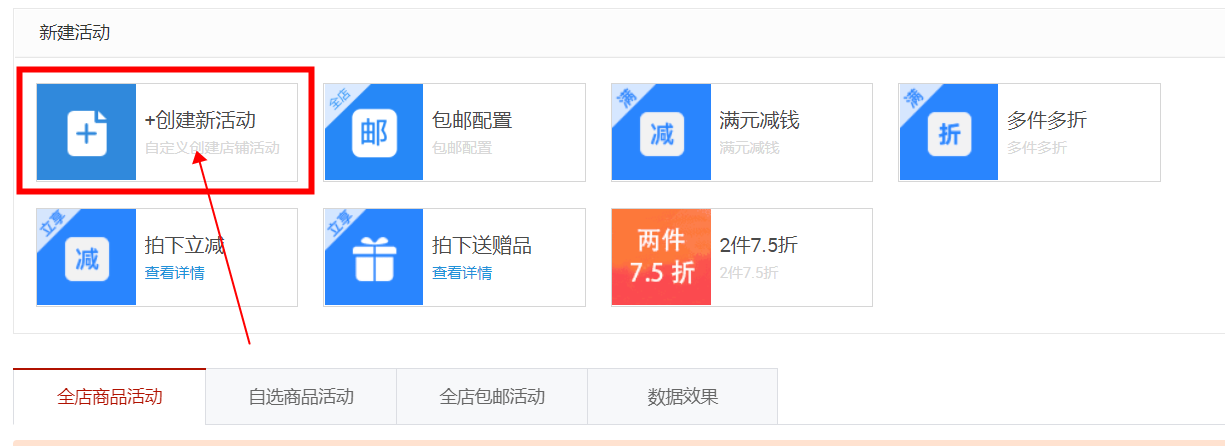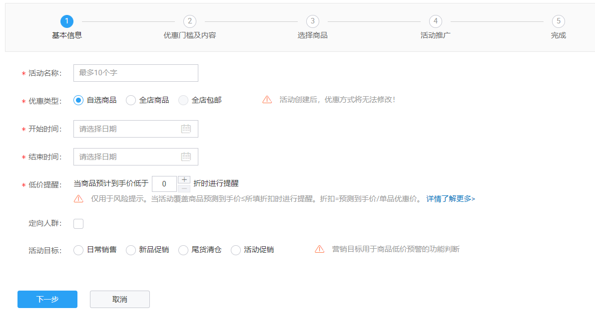 2、点击【创建新活动】,选择全店商品或者自选商品(指定商品),填写好活动名称和活动时间信息之后点击下一步,如下图,