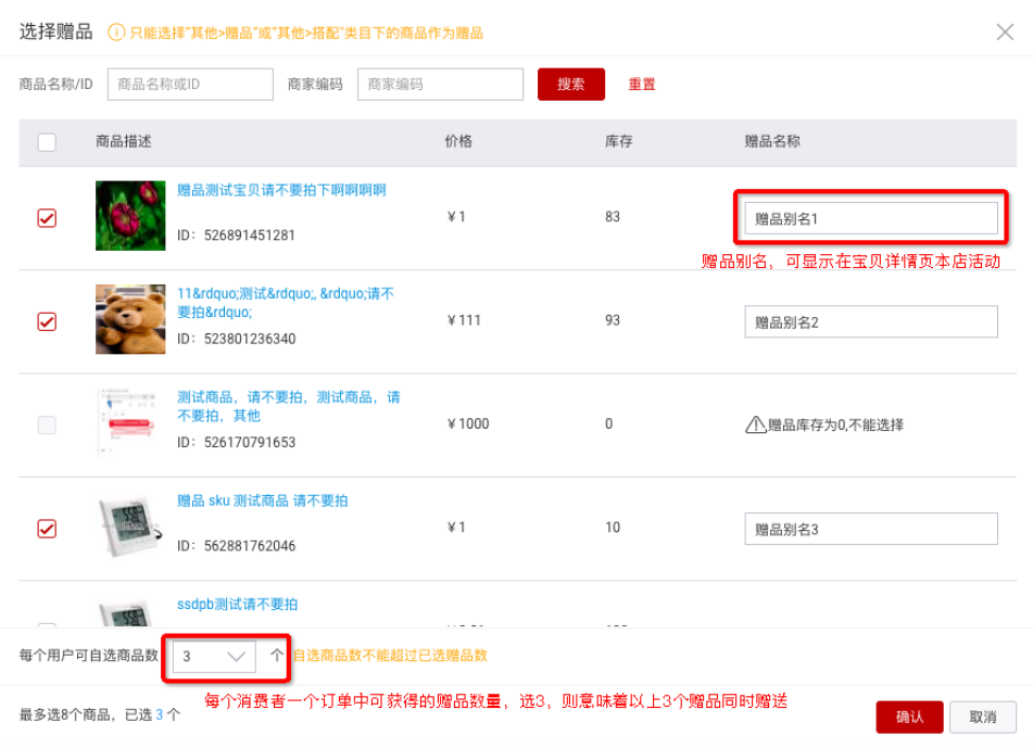 4、赠品请发布到“其他-赠品类目”或“其他-搭配类目“下,支持宝贝id、名称及编码搜索,最多可选8个商品,设置赠品名称和每个消费者可获得的赠品数量;