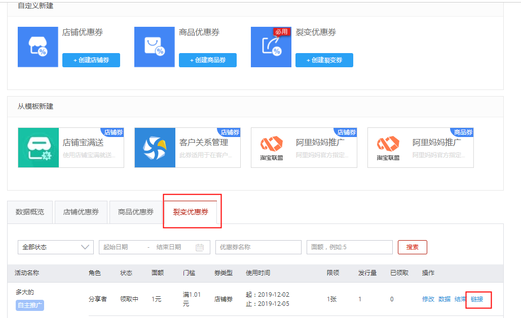 注意:该页面只有创建优惠券时选择的推广渠道为【通用】,【自主推广】 时才可以复制链接,领券中心、商家群的2个定向渠道是无法复制链接的;
