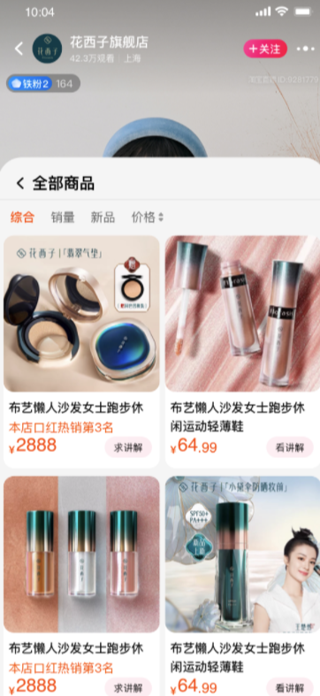 点击后将跳转到宝贝详情页,在这里可完成订阅讲解/看讲解 的动作,还可以使用和店铺一样的排序能力(销量/新品/价格高到低/价格低到高);