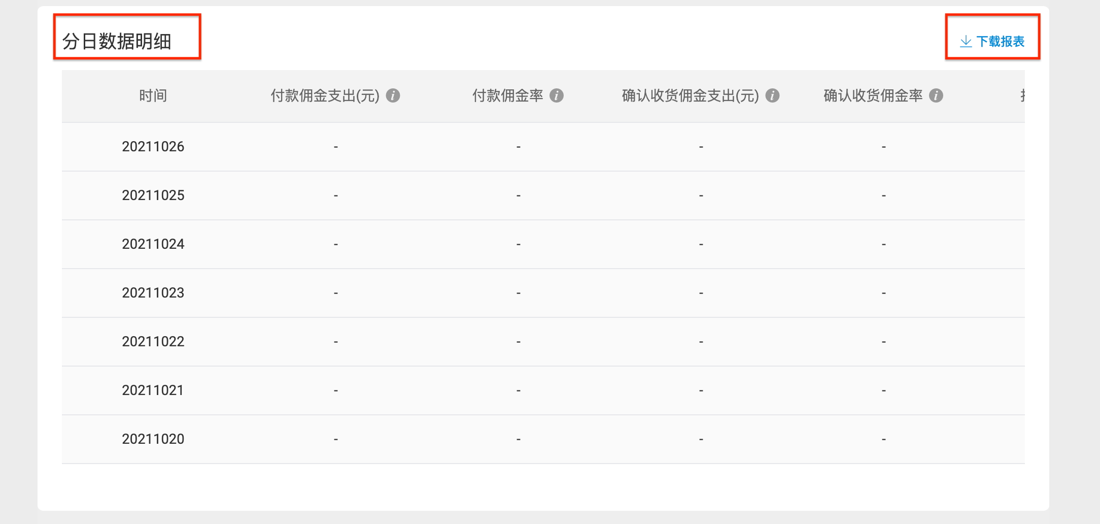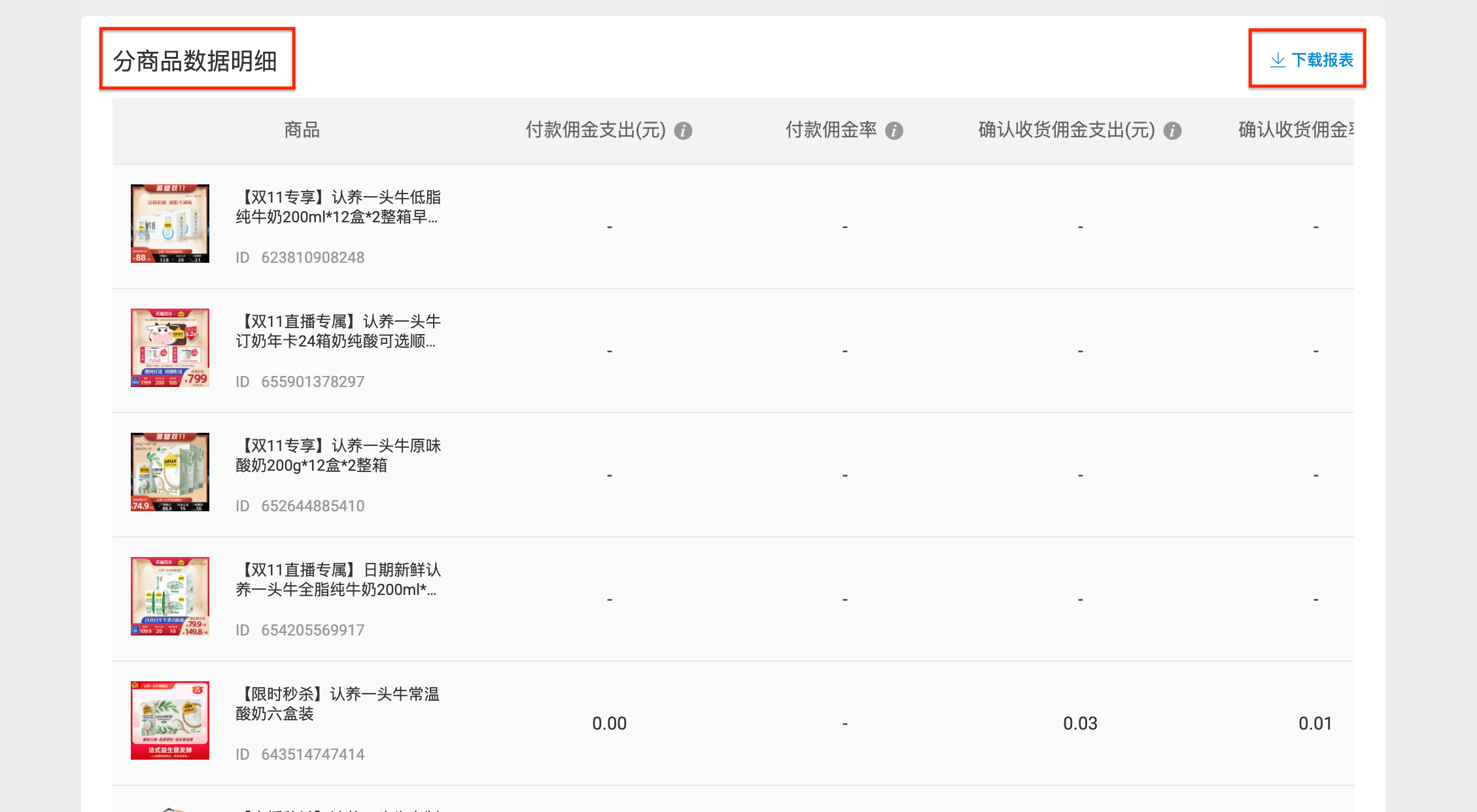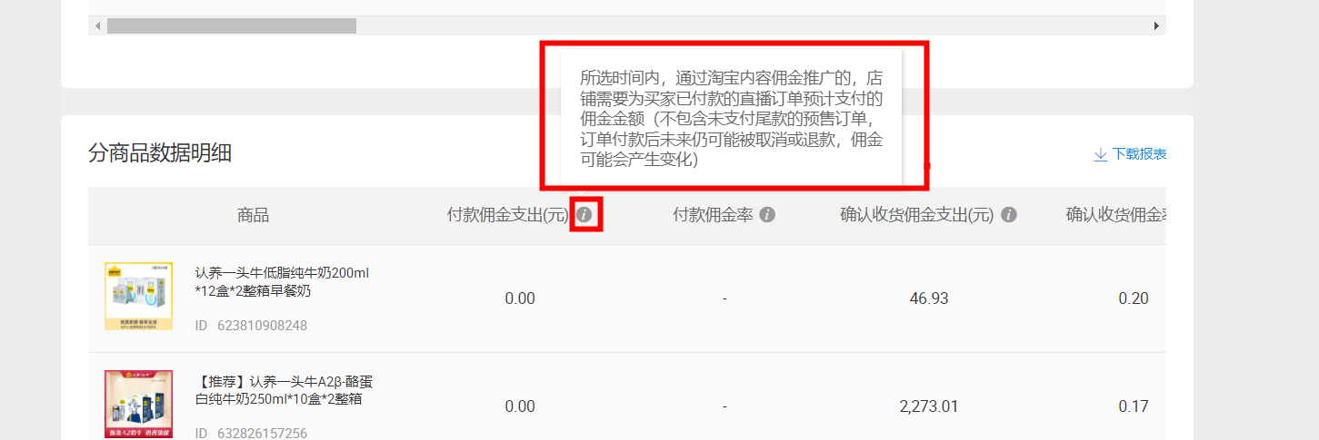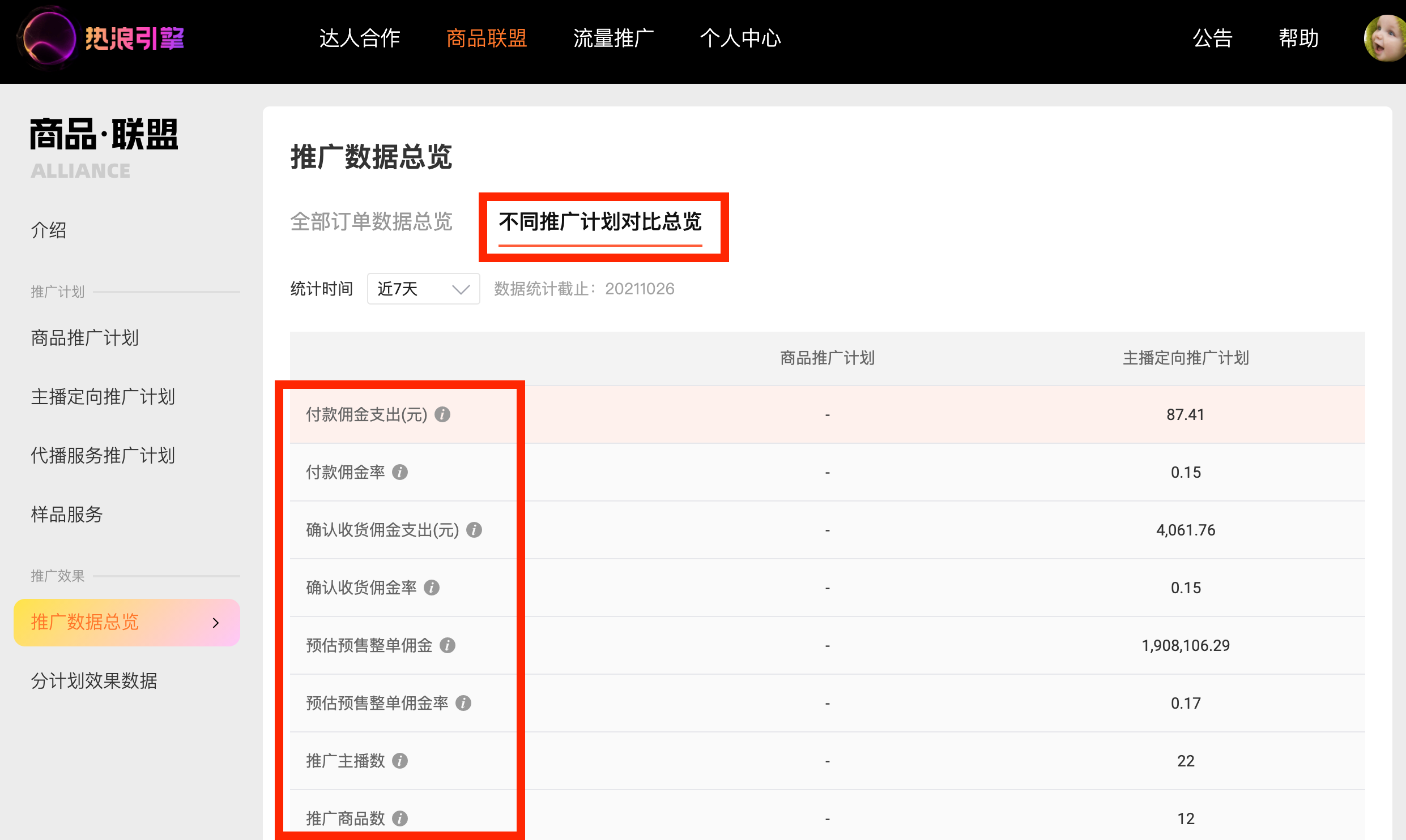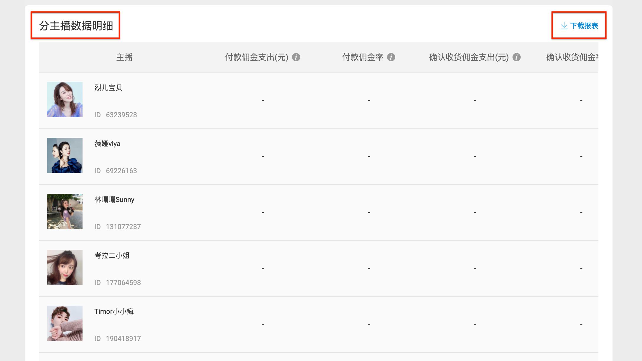 点击【分计划效果数据】,可以看到通用推广计划、主播定向推广计划对应的效果数据;商家下拉可以看到【分日数据明细】,【分商品数据明细】,【分主播数据明细】,目前暂时只有分日的明细和分主播的明细,已主播维度的详细或者分日明细暂时还没有推出,请您后续关注。