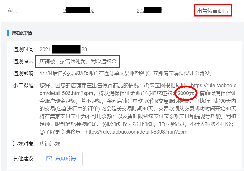 违约金会伴随着一个单独的出售假冒商品处罚,罚没金额可在违规详情的小二提醒中查看